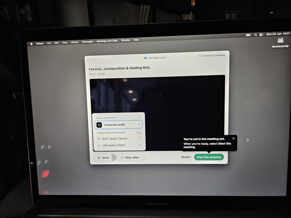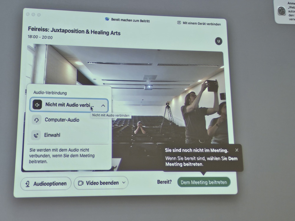 Damit externe Redner und ihr Screensharing im Raum und in der Aufnahme sichtbar sind, muss der Präsentationsrechner die Webex-Konferenz anzeigen. Neben dem Streamingrechner muss daher auch der Präsentationsrechner in der Konferenz sein (über einen separaten Account).